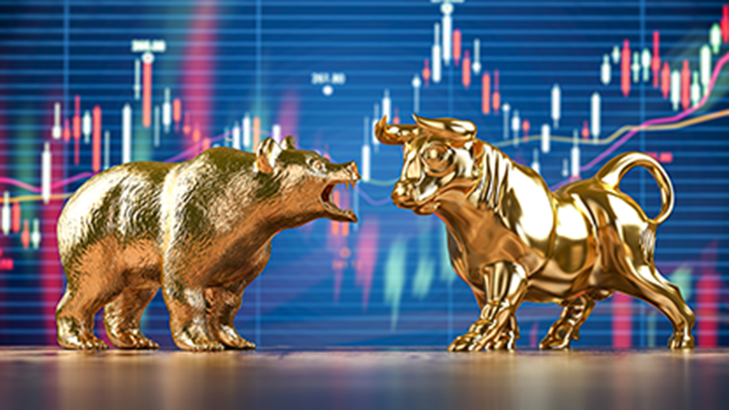 Golden bull and bear on stock data chart background. Investing, stock exchange financial bearish and mullish market concept. 3d illustration